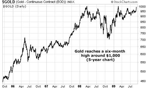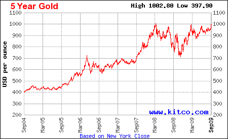Najvišja zgodovinska vrednost, ki jo je zlato doseglo 17. marca 2008, to je 1.033,90 USD za trojaško unčo, ni več daleč. V petek, 11. septembra je zlato na COMEX doseglo vrednost 1009,90 USD za unčo čistega zlata pri dnevni najnižji vrednosti EUR/USD 1,4584. Za unčo zlata je bilo potrebno odšteti 696,24 EUR.