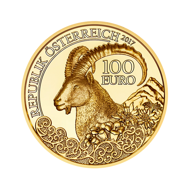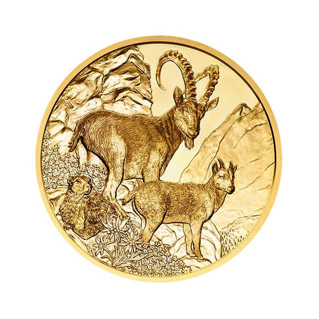 Sprednja stran kovanca prikazuje profil kozoroga v naravnem okolju, obdanega z alpskimi trobenticami in planiko. Na zadnji strani je na strmih skalah prikazan alpski kozorog z mladičkom in v družbi svizca. Ponovno je opazen čudovit dizajn, ki pravzaprav doda posebno rustikalno eleganco vsem kovancem v seriji Divje živali.