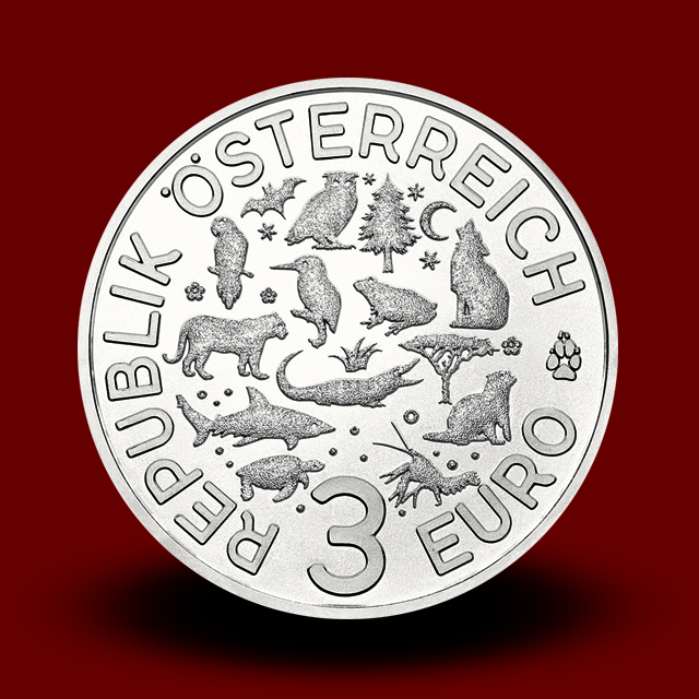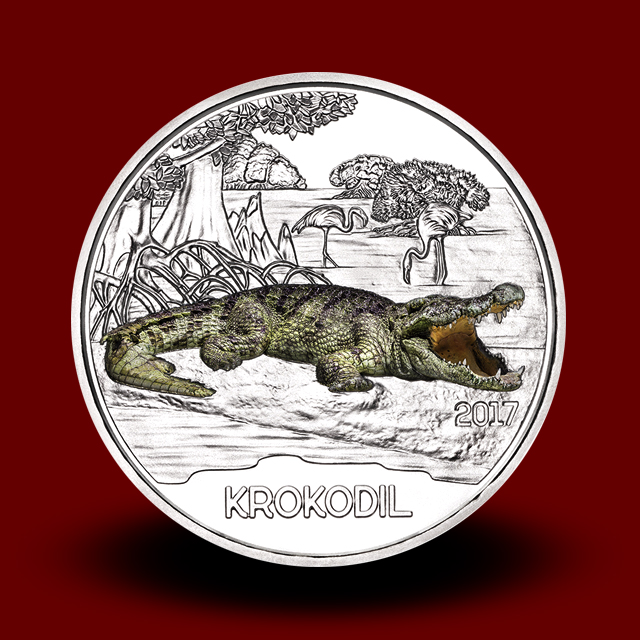 Na sprednji strani 16 g (Cu/Ni) kovanca s premerom 34 mm je upodobljen krokodil na peščenem pobočju pred prostrano pokrajino tropskih mangrov in flamingov, na zadnji strani pa so obrisi vseh 12 živali v seriji in nominala 3 evre. Kovanci so zakonito plačilno sredstvo v Avstriji in bodo v nakladi 50.000 kovancev izhajali vsake tri mesece, vse do leta 2019.