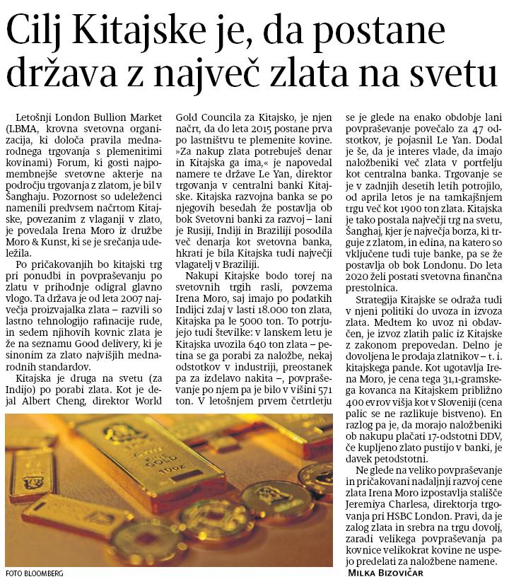 Letošnji London Bullion Market (LBMA, krovna svetovna organizacija, ki določa pravila mednarodnega trgovanja s plemenitimi kovinami) Forum, ki gosti najpomembnejše svetovne akterje na področju trgovanja z zlatom, je bil v Šanghaju. Pozornost so udeleženci namenili predvsem načrtom Kitajske, povezanim z vlaganji v zlato, je povedala Irena Moro iz družbe Moro & Kunst, ki se je srečanja udeležila.