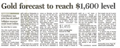 Vodilni finančni dnevnik Financial Times je med drugim povzel izjavo Philipa Klapwijka, da so investitorji zaskrbljeni zaradi napovedane inflacije, vlade pa pokažejo le malo interesa, da bi bistveno zaostrile monetarno politiko. Že drugo leto povečana proizvodnje zlata potrjuje, da se po letih upadanja, rudarska industrija zdaj pozitivno odziva na naraščajoče cene zlata.