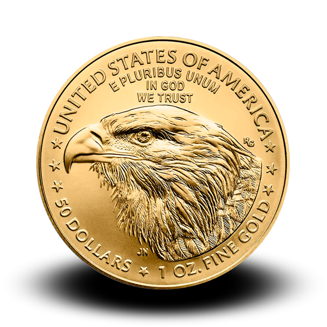 The American Gold Eagle, authorized under the Gold Bullion Act of 1985, was first released by the United States Mint in 1986. Gold Coins contain 916,7/1000 Au, 30/1000 Ag and 53,3/1000 Cu. The obverse design features a rendition of Augustus Saint-Gaudens' full length figure of Lady Liberty. The reverse design, by sculptor Miley Busiek, features a male eagle carrying an olive branch.