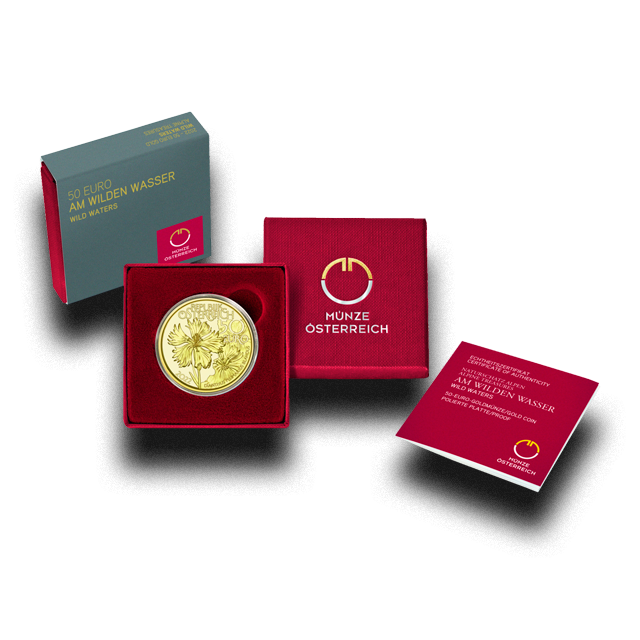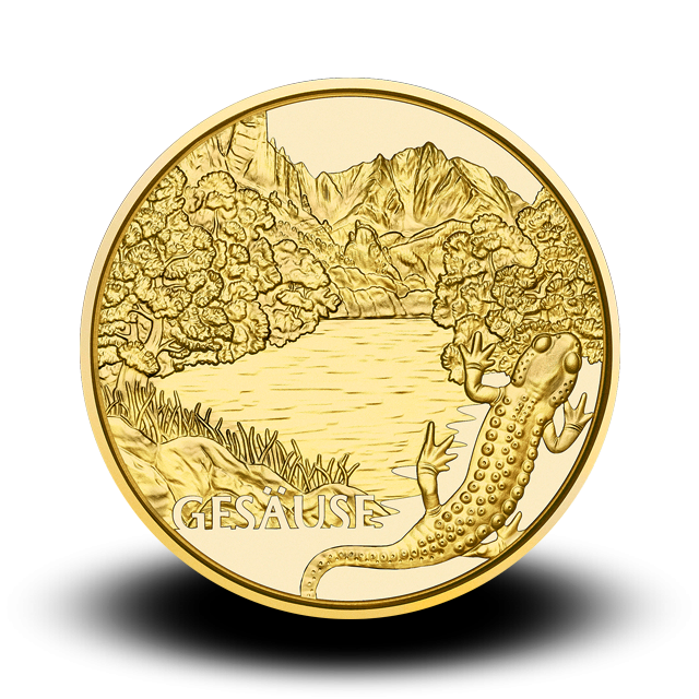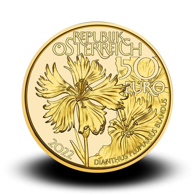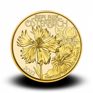 The plant features on the coin’s obverse, its Latin name, Dianthus plumarius blandus, inscribed on the lower right-hand side. The reverse depicts the gateway to the Gesäuse: an immense natural panorama framed by forest with the River Enns flowing beneath the imposing 2,335 metres of the Großer Ödstein. In the foreground, an alpine salamander crawls across the coin.