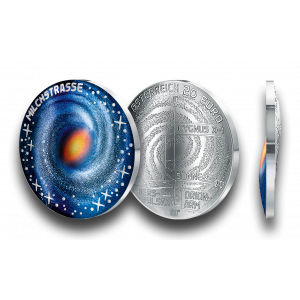 The combination of the convex and the concave surfaces on the coin’s obverse results in an S-shaped silver surface upon which the Milky Way is depicted. The angular dimensions of the galactic coordinate system show the position of the sun in relation to the rest of our galaxy. The position of the Orion Arm, in which our solar system is located, is also marked. So are the positions of the astronomical phenomena Cygnus X-1 and Crab Pulsar, which play a special role on the other two coins in the series. The coin’s reverse features the same image of the spiralled Milky Way, though in spectacular, colour-printed form.