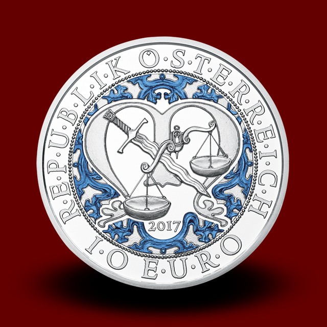 The reverse of the 10 euro silver coin shows a detail adapted from the famous depiction of Saint Michael slaying the dragon, painted on the altar of the church of Saint Miquel de Soriguerola in Catalonia, Spain. The painting, which dates from the end of the 13th century, can be found today in the Museu Nacional d’Art de Catalunya in Barcelona. The coin’s obverse shows a sword with a waved blade crossed with a set of scales framed inside the letter M. Counting among popular symbols of Michael, these are surrounded by a rich blue grapevine design.