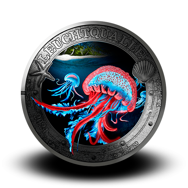 All 12 of the magical sea creatures in the series are shown in silhouette on the coin’s obverse. On the coin’s reverse an old-fashioned porthole frames an aquatic scene that features a mauve stinger in the centre. An island with palm trees can be seen above the surface of the water. When the coin is illuminated with ultraviolet light, the jellyfish glows and changes colour.