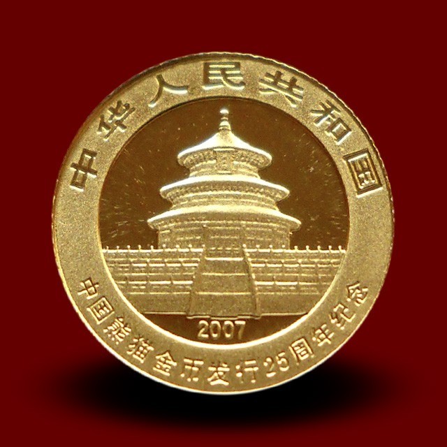 The Chinese Gold Panda is a series of gold bullion coins issued by the People's Republic of China. The coins were introduced in 1982. The gold Panda coins come in different sizes and denominations. The obverse depicts the Temple of Heaven with Chinese characters on top saying "Zhonghua Renmin Gongheguo" meaning People's Republic of China. The reverse depicts different portraits of panda.