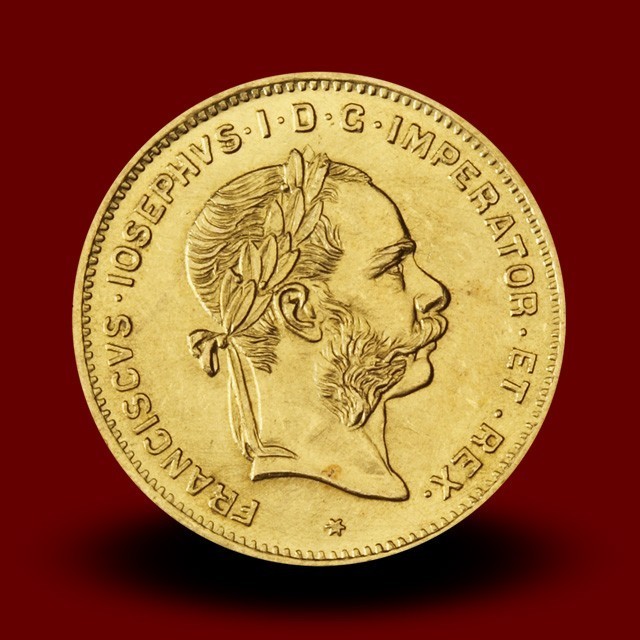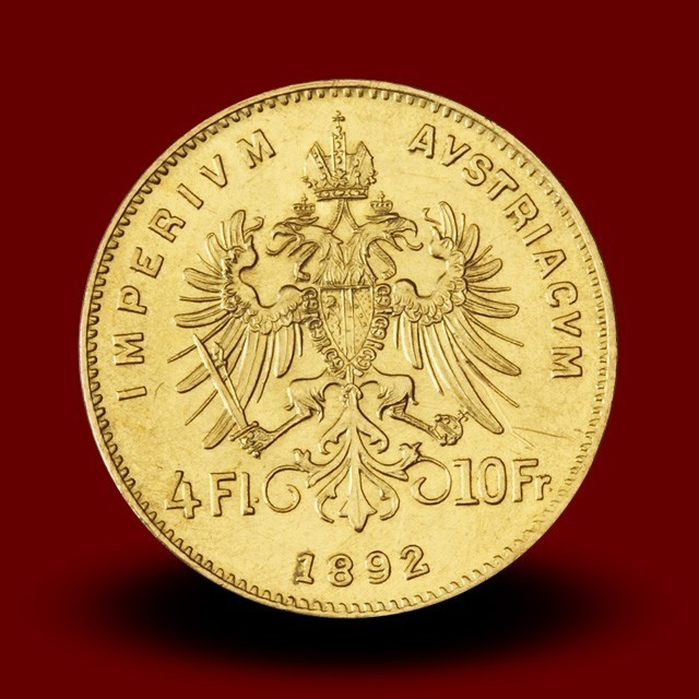 The 4 Florin gold coins were designed as trade coinage between 1870 and 1892. The Florin gold coins were minted in two denominations: the 4 Florin gold coins with a face value of 10 Francs and the 8 Florin gold coins with the corresponding value of 20 Francs. Nowadays, the Austria Mint is still producing the 4 Florin 10 Francs gold coins as gold bullion coins and they are all dated by 1892.