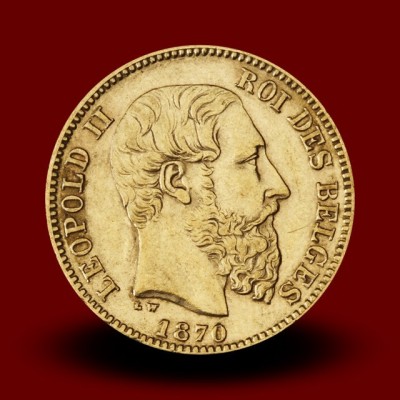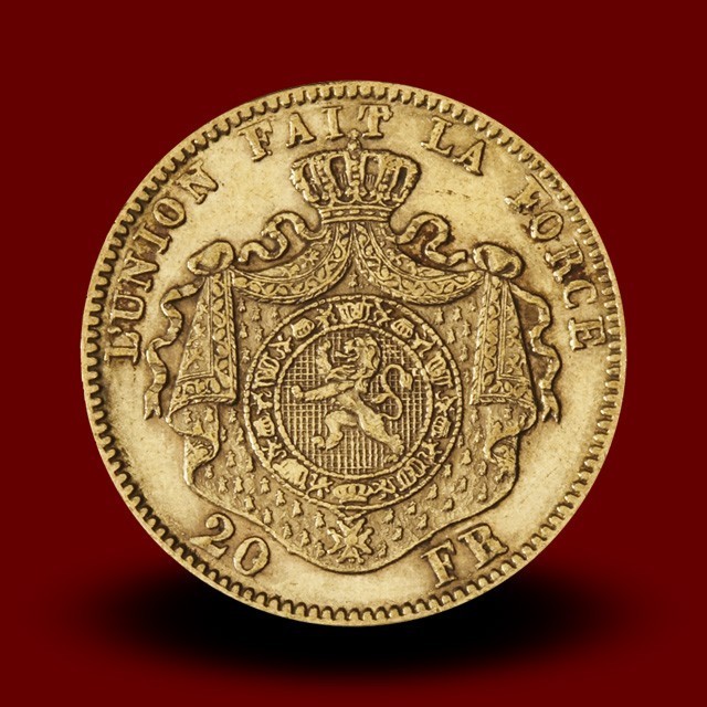 The 20 Francs gold coin is from Belgium. Featuring the portrait of Leopold II issued 1870 - 1882 (the earlier version was issued 1867 - 1870 and differs only slightly), the reverse has the Belgian coast of arms and the inscription L'UNION FAIT LA FORCE. This was the motto used by Belgium after it's revolution of 1830.