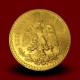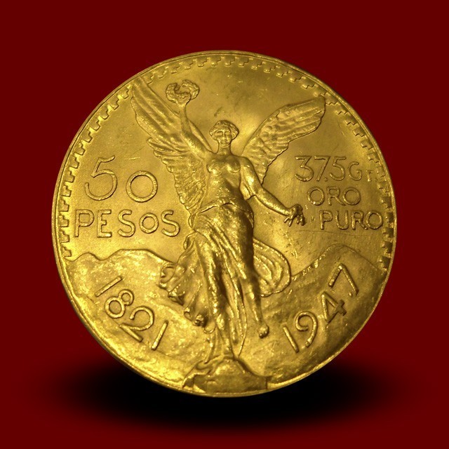 The Centenario or 50 Mexican Peso gold pieceis was first minted in 1921. On the obverse of the coin, a portrait of the Winged Victory (El Angel) is featured with the iconic Mexican volcanoes Ixtaccihuatl and Popocateptl. It shows the date 1821 to the left, to mark the first year of Mexico’s independence from Spain. The reverse features the Mexican coat of arms with an eagle.