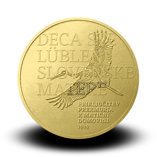 The Republic of Slovenia is issuing collector coins to mark the centenary of Prekmurje rejoining its homeland. The design centres on a quote from Jožef Klekl the Elder, a writer and supporter of Slovene nationhood, from the 17 August 1919 issue of the local newspaper Novine, together with the image of a stork on the wing. That it is flying from right to left, i.e. east to west, adds extra symbolism.