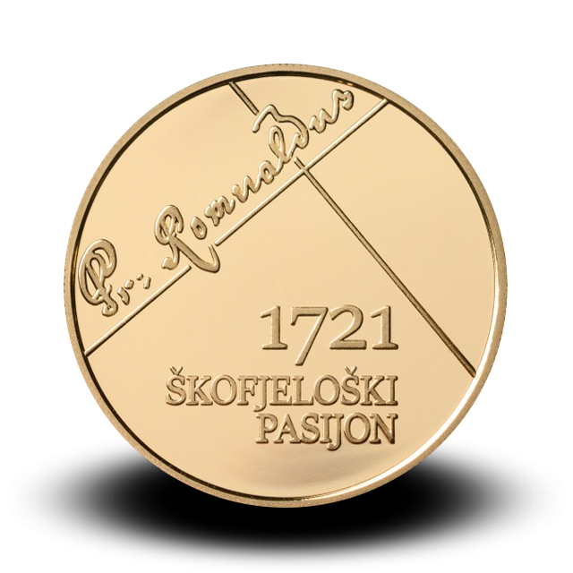 The Republic of Slovenia is issuing collector coins to mark the 300th anniversary of the Škofja Loka Passion. The central element of the design is a cross, with the meeting point of the straight lines representing the centre of the events – the streets of Škofja Loka. Around the cross on the front side of the coin, three broken lines represent not just the auditorium but also the crown of thorns. Each of the 13 vertices of the crown represent one of the depictions in the Škofja Loka Passion. Despite this being just a partial depiction of the crown, it is perceived as a circle which in some way reflects the cyclical performing of the Passion.