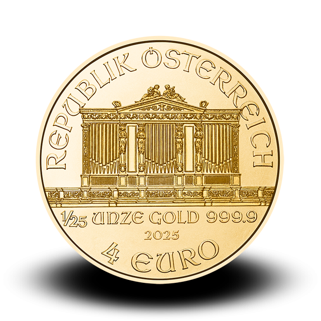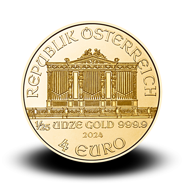 Vienna Philharmonic Gold Coin is struck since 1989 in pure gold (999,9/1000). The obverse of the coin depicts the great organ in Vienna's concert hall. The obverse shows a harmonious medley of musical instruments. The Philharmonic is minted in one-ounce (troy), half-ounce, quarter-ounce and one-tenth ounce sizes. Earlier mintages before the creation of the euro were denominated in schillings.