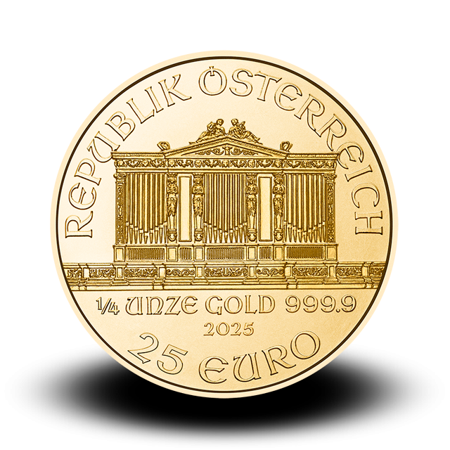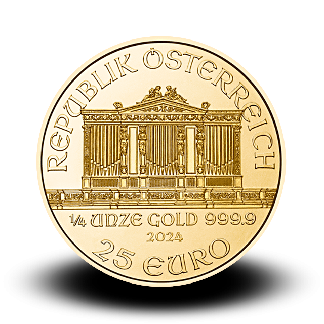 Vienna Philharmonic Gold Coin is struck since 1989 in pure gold (999,9/1000). The obverse of the coin depicts the great organ in Vienna's concert hall. The obverse shows a harmonious medley of musical instruments. The Philharmonic is minted in one-ounce (troy), half-ounce, quarter-ounce and one-tenth ounce sizes. Earlier mintages before the creation of the euro were denominated in schillings.
