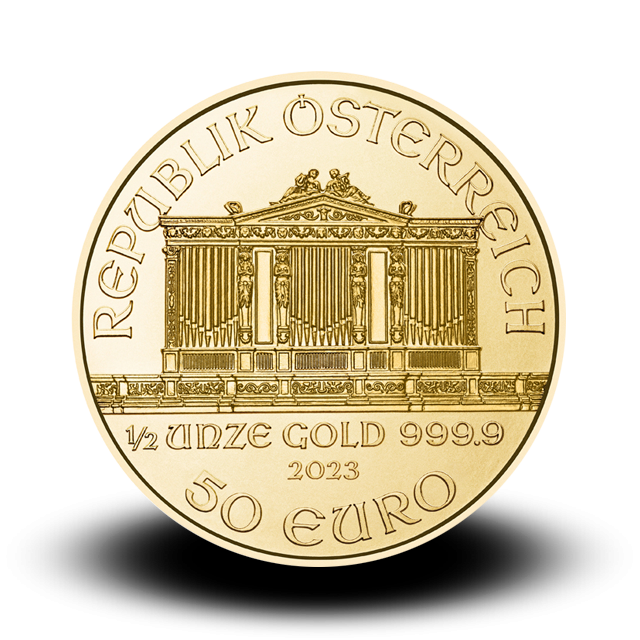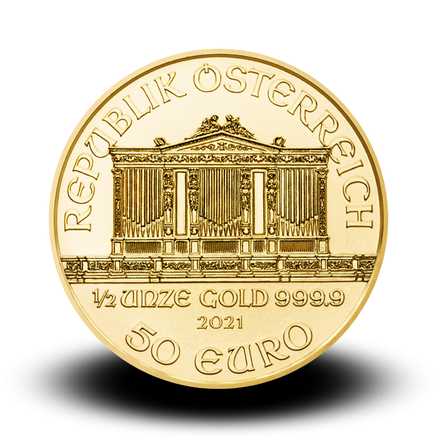 Vienna Philharmonic Gold Coin is struck since 1989 in pure gold (999,9/1000). The obverse of the coin depicts the great organ in Vienna's concert hall. The obverse shows a harmonious medley of musical instruments. The Philharmonic is minted in one-ounce (troy), half-ounce, quarter-ounce and one-tenth ounce sizes. Earlier mintages before the creation of the euro were denominated in schillings.