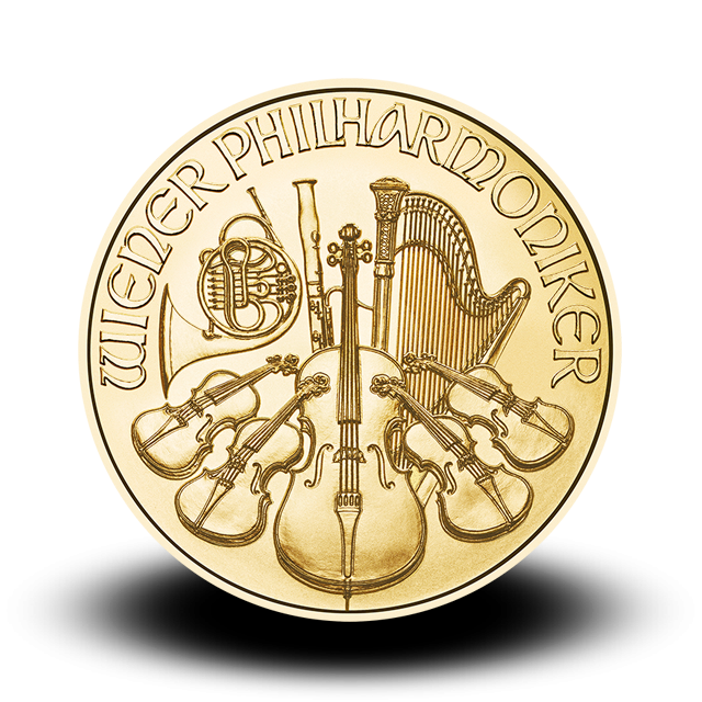 Vienna Philharmonic Gold Coin is struck since 1989 in pure gold (999,9/1000). The obverse of the coin depicts the great organ in Vienna's concert hall. The obverse shows a harmonious medley of musical instruments. The Philharmonic is minted in one-ounce (troy), half-ounce, quarter-ounce and one-tenth ounce sizes. Earlier mintages before the creation of the euro were denominated in schillings.