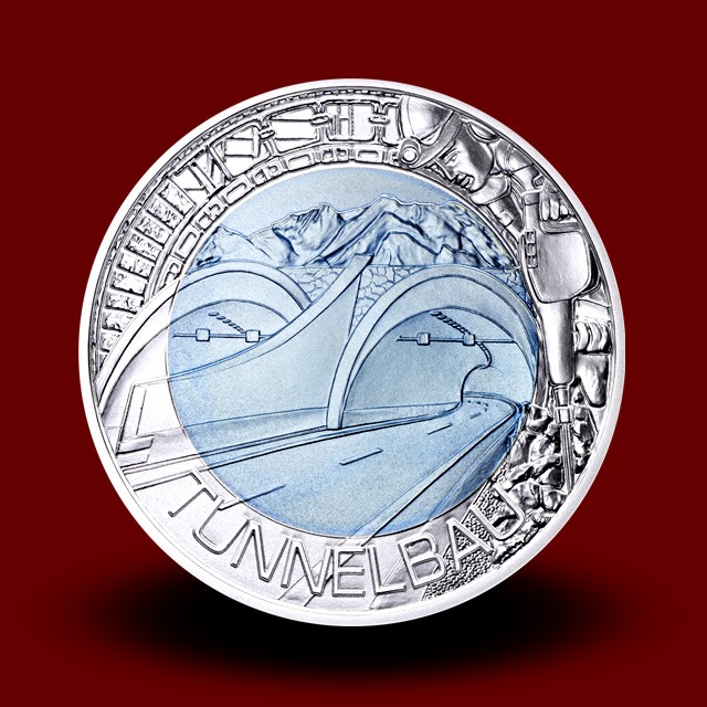 V ledeno modri niobijevi sredici je na sprednji strani kovanca upodobljen vrtalni stroj, ki prodira v kamnino. Zadnja stran kovanca v sredini prikazuje enega izmed mnogih avtrijskih predorov, na robu kovanca pa je delavec s pnevmatskim vrtalnikom.
