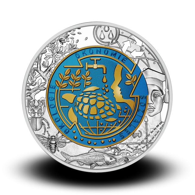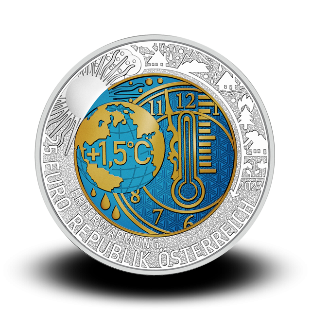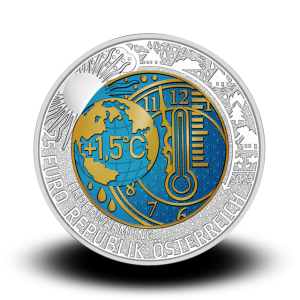 Na novem srebrniku je upodobljen termometer, sprednja stran kovanca iz modrega in zlatega niobija tvori del ure, ki simbolizira iztek časa. V središču hrbtne strani kovanca je globus, ki prikazuje ekonomske, ekološke in socialne vidike trajnosti. Desno sta silhueti dveh človeških obrazov, pred njima plava morska želva. Zaradi onesnaženosti okolja in globalnega segrevanja tej vrsti grozi izumrtje.