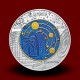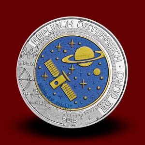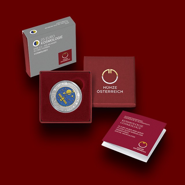 Kovanec je posvečen KOZMOLOGIJI, znanstveni veji fizike, ki proučuje nastanek, razvoj in zgradbo Vesolja. Niobij v kovancu je obarvan v dveh barvah, modri in rumeni. Na sprednji strani je upodobljen planet Saturn, ki ga obkrožajo zvezde, in evropska vesoljska sonda Rosetta, prvo vesoljsko plovilo v orbiti kometa. Hrbtna stran kovanca prikazuje planete v svojih orbitah in največji optični teleskop na svetu E-ELT (European Extremely Large Telescope), ki je trenutno v gradnji v puščavi Atacama v Čilu.