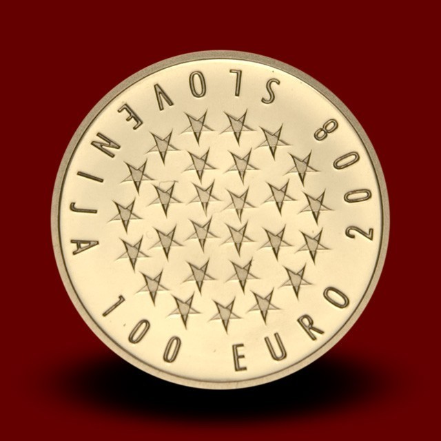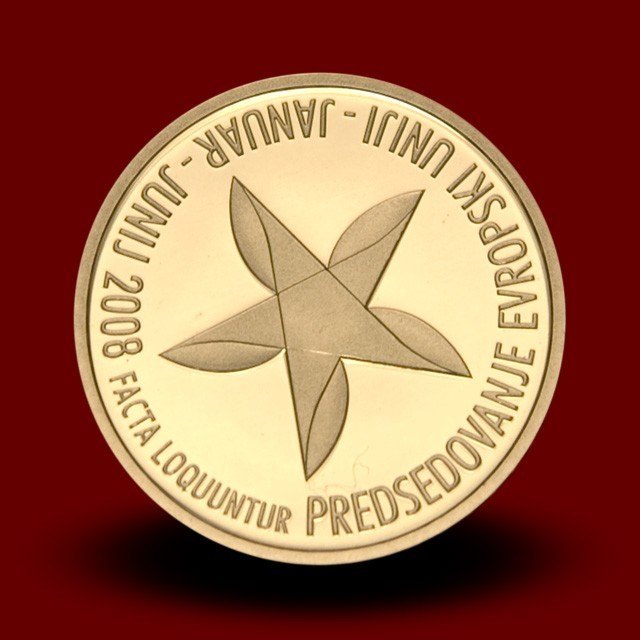 To mark Slovenia’s presidency of the European Union, the Republic of Slovenia has issued collector coins with a “dynamic” EU star in the form of a windmill on the front side. The star represents Slovenia’s initiative, movement, energy, volition, strength and active role during the EU presidency. Furthermore, the inscription on the coin “Facta loquuntur” (“works speak”), indicates that the EU presidency will be geared to results and success. On the reverse side, 27 dynamic stars represent the 27 EU Member States.