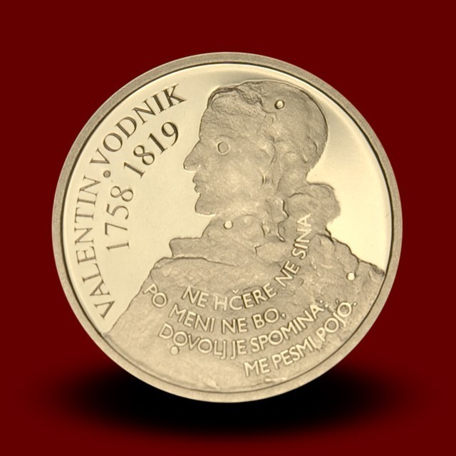 In honour of the 250th anniversary of the birth of Valentin Vodnik, the Republic of Slovenia has issued collectors coins with Valentin Vodnik’s profile as the central motif. The bottom portion of the coin is inscribed with the last verse of the poem Moj spomenik: NE HČERE NE SINA PO MENI NE BO, DOVOLJ JE SPOMINA: ME PESMI POJÓ. (NO DAUGHTER, NO SON WILL FOLLOW ME, MEMORY IS ENOUGH: SONGS SUNG OF ME).