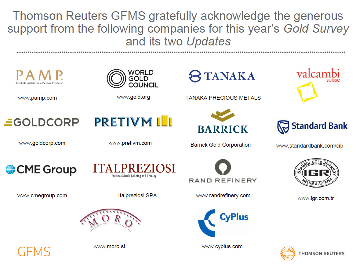 Družba Moro je v letošnjem letu podprla mednarodni inštitut Thomson Reuters GFMS iz Londona in s tem prispevala pomemben delež k mednarodnim raziskavam na področju zlata. Vse raziskave so objavljene v publikaciji Gold Survey 2013, na 127 straneh, v angleškem jeziku. V kolikor želite pridobiti še več informacij, vam publikacijo pošljemo v tiskani obliki ali po elektronski pošti.