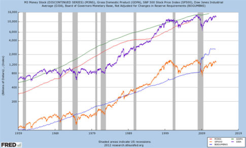 Slika 4 ZDA – Monetarna agregata M0 ( modra ) in M3 (rdeča ), GDP ( zelena ), S&P500 ( oranžna ) ter DJIA ( vijoličasta )