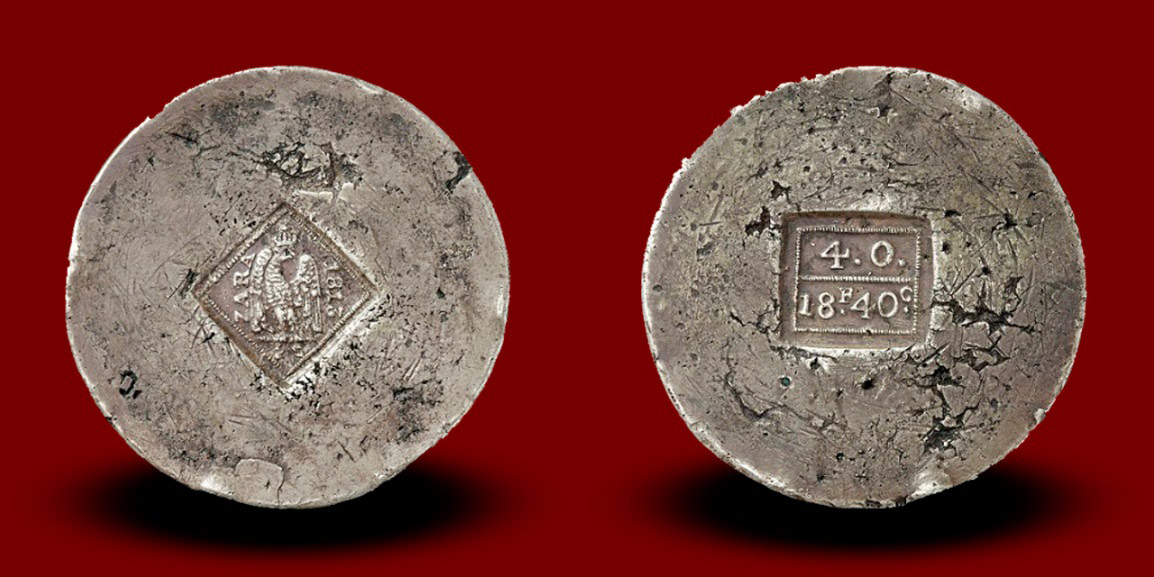 Na sprednji strani je vtisnjen kvadrat, v katerem je cesarski orel z razpetimi krili, na njegovi levi strani napis Zara, na desni pa letnica 1813. V kvadratu na zadnji strani kovanca je vtisnjena oznaka za maso, 4.0. (franc. unče) in vrednost, 18F.40C. Po bitki narodov pri Leipzigu je bil francoski cesar Napoleon I. (1804-1814/15) poražen, njegov imperij pa je pričel postopoma razpadati. Dalmacija je bila po padcu Beneške republike do leta 1806 avstrijska, zato so hoteli pridobiti nazaj nekdanja ozemlja. Mesto Zadar se je po 36 dneh obleganja z morske in kopenske strani predalo. V tem času so, kot dokaz suverenosti nad mestom in kot plačilno sredstvo izdajali zasilni denar. Ta je obsegal tri nominale, in sicer 18 frankov in 40 centimov (4 unče), 9 frankov in 20 centimov (2 unči) in 4 franke in 60 centimov (1 unča).