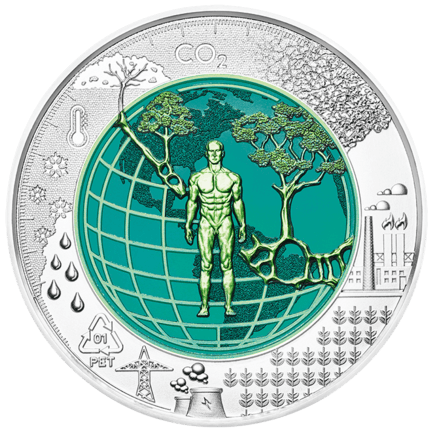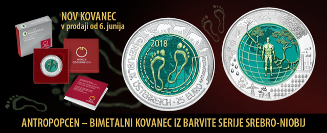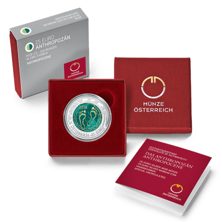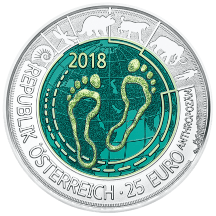 Prav antropocen je navdihnil oblikovalce dunajske kovnice Austrin Mint, ki so zasnovali podobo novega dvobarvnega srebrno-zelenega srebrnika iz serije bimetalnih kovancev. Na eni strani kovanec slikovito prikazuje dejavnosti sodobnega človeka in posledično vpliv na okolje. Na vrednostni strani kovanca pa so obrisi živih bitij iz različnih geoloških obdobij in stopala na zemeljski krogli, ki simbolizirajo sledi, ki jih je človek pustil na planetu. Nam bo v prihodnosti uspelo biti nežnejši?