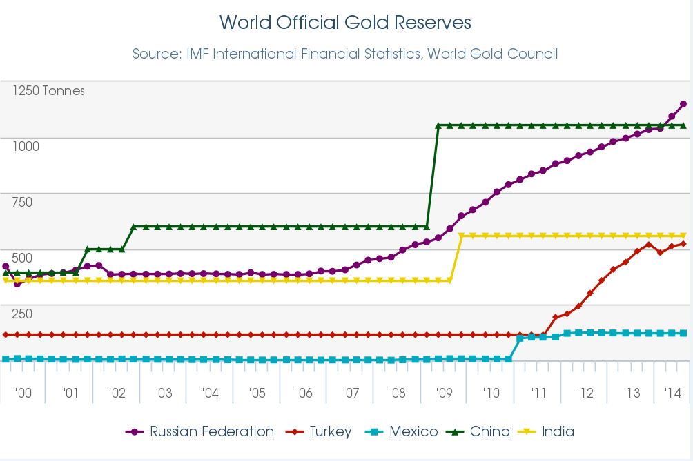 Po zadnjih podatkih World Gold Council so med največjimi kupci zlata na svetu Rusija, Kitajska, Indija, Turčija in Mehika. Predvsem Rusija vztrajno kupuje zlato. Zaloge zlata v Sloveniji ostajajo z 3,2 tonami nespremenjene.