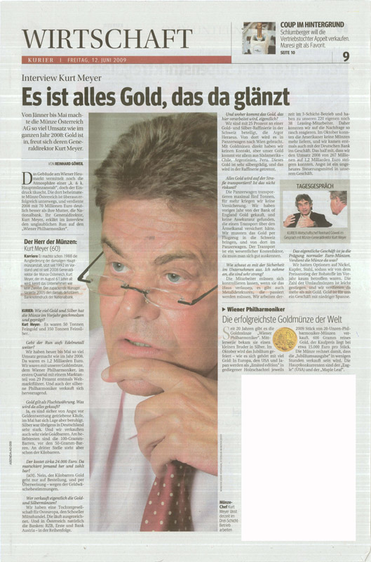 »Od januarja do maja letos je imela avstrijska kovnica Münze Österreich toliko prihodkov kot celotno leto 2008, to je 1,2 milijard EUR,« je v intervjuju za avstrijski KURIER poudaril predsednik uprave Kurt Meyer. V nadaljevanju objavljamo original in ključne povzetke objavljenega pogovora.