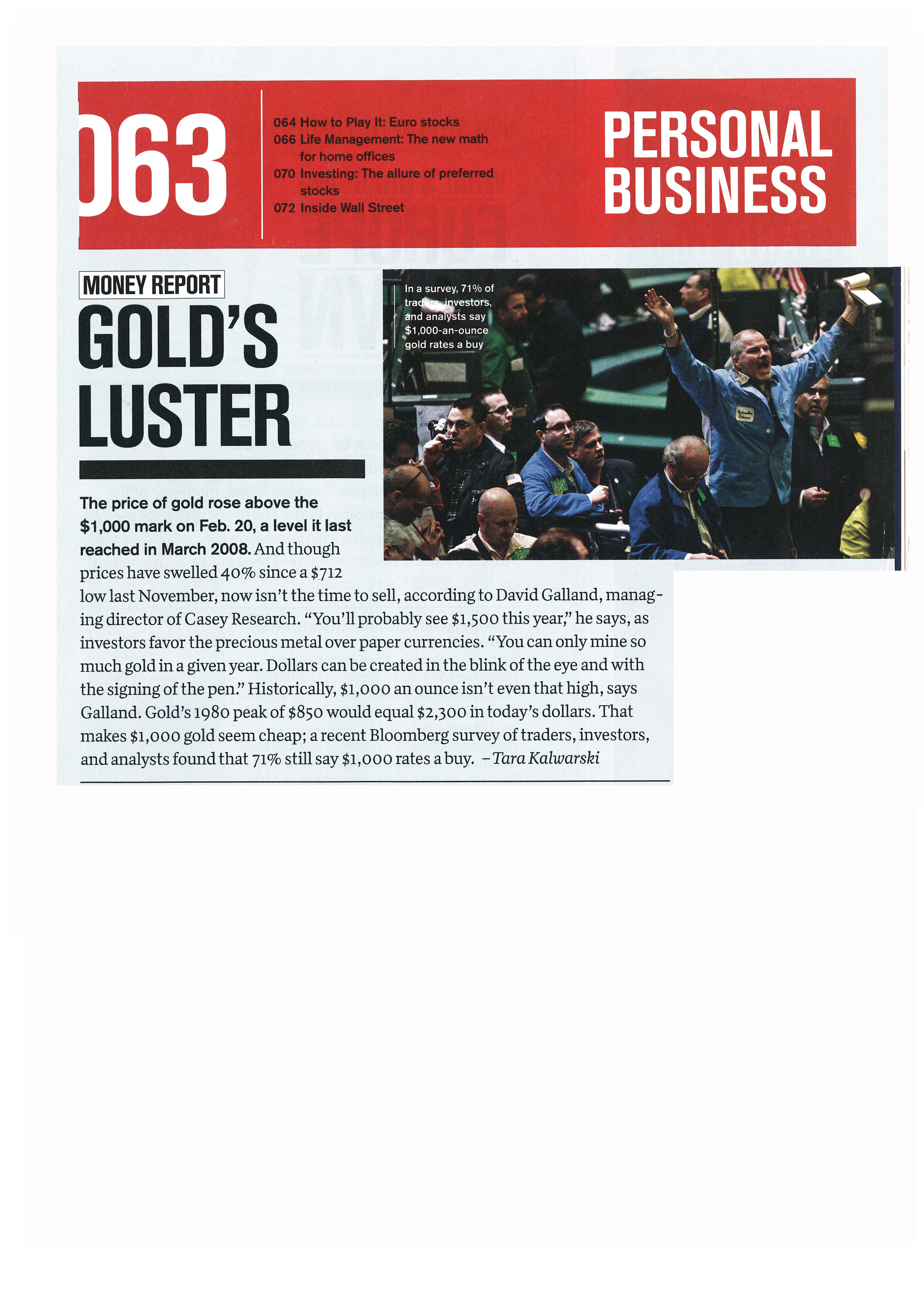 Revija Business Week je v zadnji številki objavila tekst z naslovom Gold’s luster. Zanimiv je podatek, da je leta 1980 najvišjo ceno zlato doseglo z 850 dolarji, kar je enakovredno današnjim 2.300 ameriškim dolarjem.