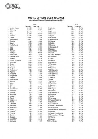 World Gold Council je nedavno objavil najnovejše podatke o monetarnih rezervah zlata za posamezne države. Podatki obsegajo vrednosti v tonah. Hkrati je izračunan tudi odstotek deleža zalog zlata v skupnem državnem premoženju. Slovenija je po monetarnih zalogah na 86 mestu s 3,2 tonami zlata, kar predstavlja po izračunih WGC 18,5 odstotkov vseh monetarnih rezerv Slovenije. Nekatere države stalno povečujejo zaloge monetarnih rezerv. Naj navedemo podatke od julija letos, in sicer nekaj največjih nakupov zlata: Brazilija 18,9 ton, Turčija 75,8 ton, Rusija 16,1 tone, Koreja 16 ton. Turčija je na osnovi sklepa odbora za monetarno politiko od lanskega tretjega četrtletja za dvakratno povečala monetarne zaloge.