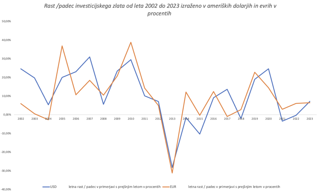 Tabela: Rast/padec investicijskega zlata od leta 2002 do 2023 izraženo v ameriških dolarjih in evrih v odstotkih.