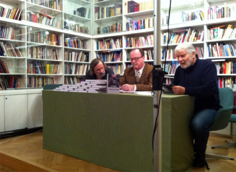 Prva predstavitev knjige Prehlad v duši je bila v Pen klubu v Ljubljani (na fotografiji dr. Luj Šprohar, Tomaž Domicelj in Boris Cavazza).