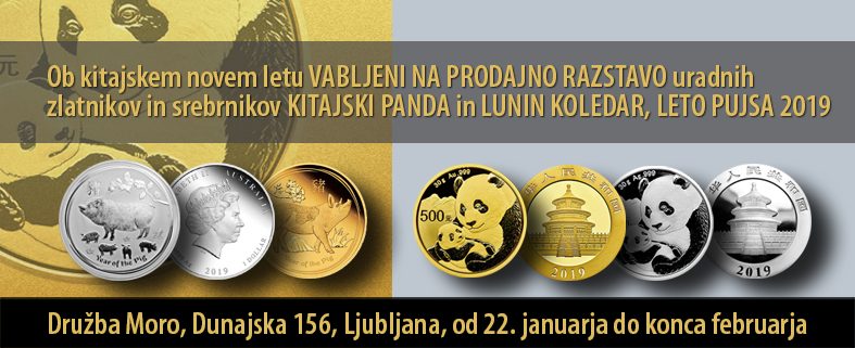 Ob začetku kitajskega novega leta 2019 smo za vas pripravili prodajno razstavo zlatnikov in srebrnikov kitajske kovnice China Gold Coin Incorporation in avstralske kovnice The Perth Mint, ki kuje kovance z živalskimi znamenji po kitajskem luninem koledarju. Razstava je v prostorih družbe Moro na ogled do konca februarja.