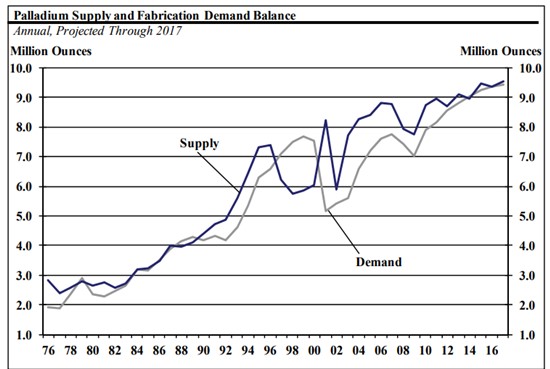 Družba Anglo American Platinum iz Johannesburga v Južni Afriki, je v letnem poročilu 2017 navedla, da je bila količina paladija v letu 2016 v primanjkljaju. Povpraševanje v avtomobilski industriji je v tem letu naraslo za 4,6 odstotkov, medtem ko se je ponudba paladija na trgu povečala le za 1,5 odstotkov. Anglo American Platinum v poročilu predvideva primanjkljaj paladija tudi v letu 2017, kar se že odraža na rasti borzne cene.