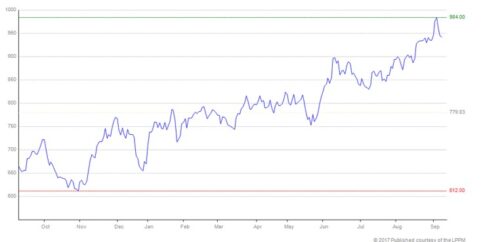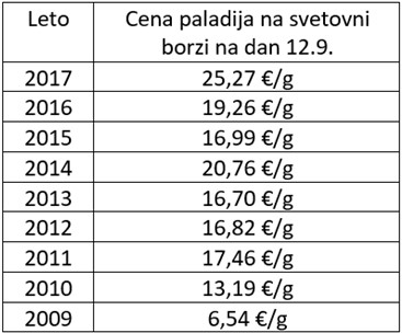 Rast cene paladija potrjuje ruska družba Norilsk Nickel, ki beleži povečanje cene paladija v prvi polovici leta 2017 za 45 odstotkov v primerjavi z lanskim letom (S & G Global Platts, Avgust 2017 ). Paladij je vztrajno v velikem primanjkljaju in razmere na trgu se še naprej zaostrujejo. Vse to se bo odražalo v močnem okrevanju cene te kovine. Svetovalno podjetje GFMS je glede na stanje na trgu naložbenih kovin v letu 2016 napovedalo, da naj bi cena paladija pred koncem leta 2017 presegla 800 ameriških dolarjev. Cena paladija bi bila tako prvič po letu 2001 višja od cene platine, je Thomson Reuters objavil v raziskavi GFMS Platinum Group Metals Survey 2017. Trenutna cena paladija se giblje okrog 940 ameriških dolarjev za trojsko unčo.