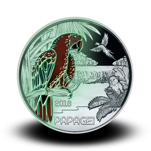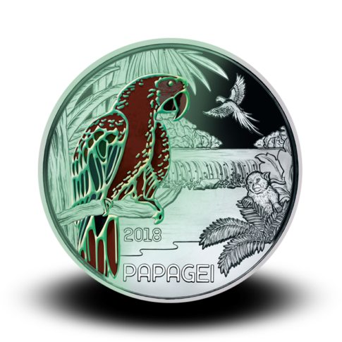 Na zadnji strani kovanca je prikazana papiga v vsej pestrosti barv in se sveti v temi. Sprednja stran je enaka predhodnim kovancem iz serije in prikazuje podobo vseh dvanajstih živali.