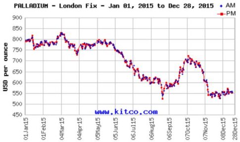 Povprečna dolarska cena paladija je v letu 2015 padla za 14 odstotkov, na 691,63 ameriških dolarjev za trojsko unčo. Cena paladija v €/g se je gibala med 14,85 (26. avgust) in 24,54 (3. september).