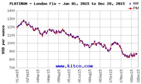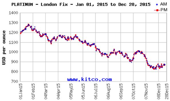 Povprečna dolarska cena platine je v letu 2015 padla za 24 odstotkov, na 1.052,91 ameriških dolarjev za trojsko unčo. Cena platine v €/g se je gibala med 24,60 (11. december) in 36,67 (23. januar).