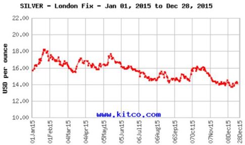 Cena srebra v €/g se je lani gibala med 0,42 (1. januar) in 0,39 (26. avgust). Povprečna dolarska cena srebra je v letu 2015 znašala 15,68 ameriških dolarjev za trojsko unčo, kar je 17,8 odstotka manj kot v letu 2014. Cena je bila pod pritiskom zaradi špekulacij o zvišanju obrestnih mer in šibkega Kitajskega gospodarstva. Namreč, srebro je hkrati tako naložba kot tudi surovina.