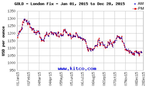 Cena zlata v €/g se je v letu 2015 gibala med 37,55 (23. januar) in 30,95 (15. december). Povprečna letna dolarska cena zlata je bila 1.160,06 ameriških dolarjev za trojsko unčo, kar je 8,4 odstotka manj kot leto prej. Cena je bila pod pritiskom zaradi špekulacij o dvigu obrestnih mer in močnega dolarja. Dodaten pritisk na ceno se je odrazil tudi na presežku zlata na trgu, ki je v letu 2015 dosegel 182 ton, leto prej 187 ton. Zaradi relativno nizke cene se je ponudba zlata na trgu zmanjšala za dva odstotka v primerjavi z letom 2014. Ponudba zlata za nadaljnjo predelavo se je malenkost povečala, količina proizvodnje v rudnikih pa je po šestih letih zastala. Izkop v rudnikih je na trg doprinesel 3.158 ton zlata oziroma le 0,8 odstotka več kot leto prej.