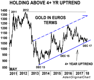 Cena zlata ni močna le v dolarjih, ampak tudi v nekaterih drugih valutah, ne glede na tečajna nihanja. Vrednost evra že nekaj časa raste, obenem raste tudi cena zlata v evrih, kot je vidno v spodnjem grafu gibanja cene zlata v zadnjih štirih letih (EUR/oz).