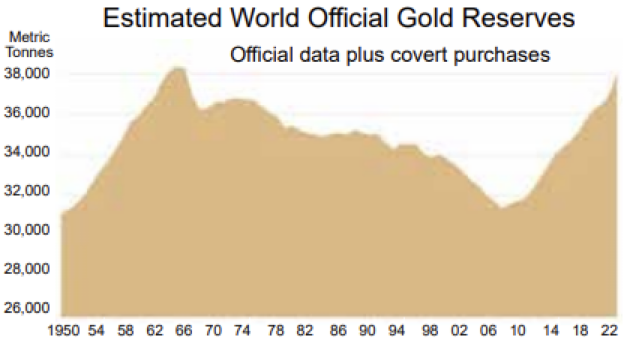 Na račun geopolitičnih napetosti in s tem povezane negotovosti se Kitajska, Rusija, Savdska Arabija in Brazilija pri transakcijah, povezanih z izvozom in/ali za nakupe naftnih derivatov poslužujejo lokalnih valut in ne več ameriškega dolarja kot včasih. Globalno zaupanje v dolar pada, kar povzroča tudi pritisk na vrednost dolarja. Šibak dolar pozitivno vpliva na vrednost zlata, ki je že mnogokrat prestalo preizkus časa. Zgodovina zlata kot valute sega več tisočletij nazaj v zgodovino, danes pa je dejansko edina globalna valuta. Tudi centralne banke se z nakupi monetarnega zlata odmikajo od izpostavljenosti ameriškemu dolarju. Zavedajo se pomena zlata kot varnega zatočišča posebej v časih, ko so geopolitične in gospodarske razmere v svetu tako napete. Kitajska je uvoz preko Hong Konga v februarju letos potrojila glede na prejšnji mesec. Na spodnji sliki je prikazano gibanje količine rezerv monetarnega zlata skozi čas in vključuje tako poročane nakupe cetralnih bank, kot tudi oceno neuradnih monetarnih zalog.