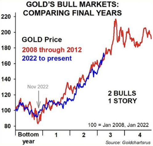 Zlato je v zadnjih 14 mesecih pridobilo osupljivih 62 odstotkov vrednosti, v letošnjem letu pa je njegova cena narasla že za 21 odstotkov, kar predstavlja največjo četrtletno rast v skoraj štirih desetletjih. Ta rast sovpada z eksplozivno fazo bikovskega trenda, ki je zelo podobna tisti iz obdobja 2008–2012, kar prikazuje spodnja slika. Če bi se ta vzorec ponovil, lahko pričakujemo še najmanj leto nadaljnje rasti, kar je izjemno spodbudno za vlagatelje. Pomemben dejavnik pri tej rasti je povpraševanje: centralne banke, zlasti iz Azije, še naprej kupujejo zlato v velikem obsegu, v zadnjem obdobju pa se jim pridružujejo tudi zahodni vlagatelji. Posebej izrazita je rast povpraševanja po zlatih ETF-jih, kar dodatno potrjuje vlogo zlata kot zavarovanja pred inflacijo in geopolitičnimi tveganji.