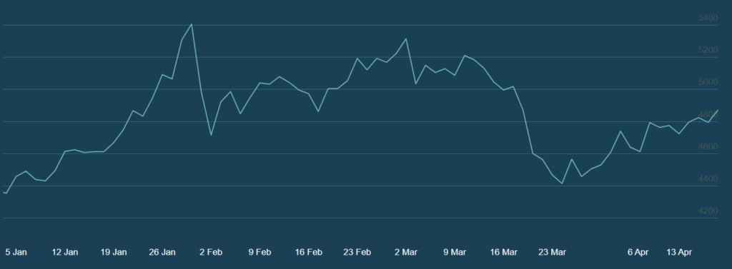 Gibanje cena zlata v obdobju januar – april 2026, v USD za trojsko unčo