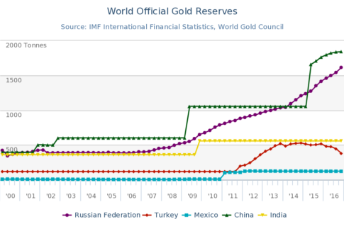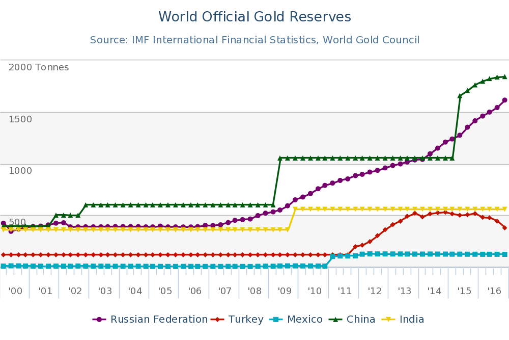Očitno je, da ruski predsednik Putin priznava zlato, saj dodaja v monetarne rezerve približno 200 ton zlata letno. Leta 2014 je Rusija dokupila 173 ton zlata, leta 2015 206 ton in 200 ton v letu 2016. Rusija, ki je tretja največja država po količini izkopanega zlata, je v zadnjih treh letih s tem dodala v rezerve nekaj več kot 70 odstotkov izkopanega zlata v Rusiji. Na prvem mestu po izkopu zlata sta Kitajska in Avstralija, ki poročata o upadanju letne količine izkopanega zlata, medtem ko Rusija poroča o rasti. Rusija letno proizvede približno 270 ton zlata. Sharps Pixley poroča, da bi lahko Rusija prehitela Kitajsko v količini monetarnega zlata že v letu 2018.