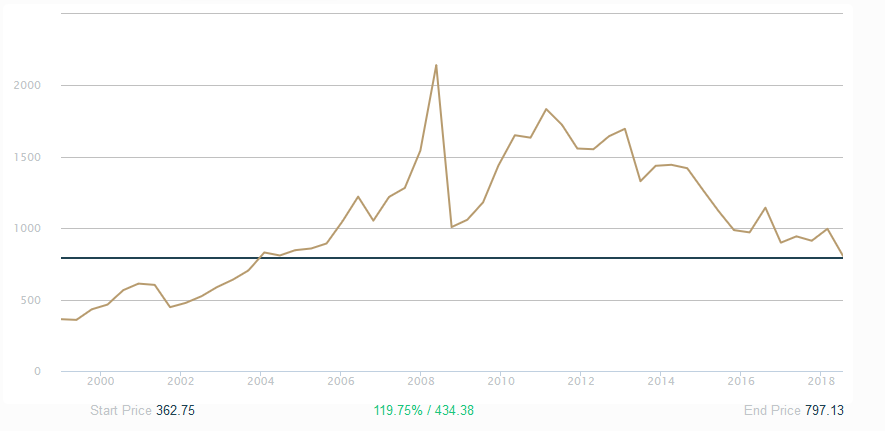 Cena platine je v obdobju od leta 2000 do danes dosegla najvišjo raven maja 2008 (2.142 dolarjev za trojsko unčo), in naj bi po desetih letih zdaj končno dosegla najnižjo raven. Trenutno je cena platine 792 dolarjev za trojsko unčo, kot prikazuje tudi spodnji graf.