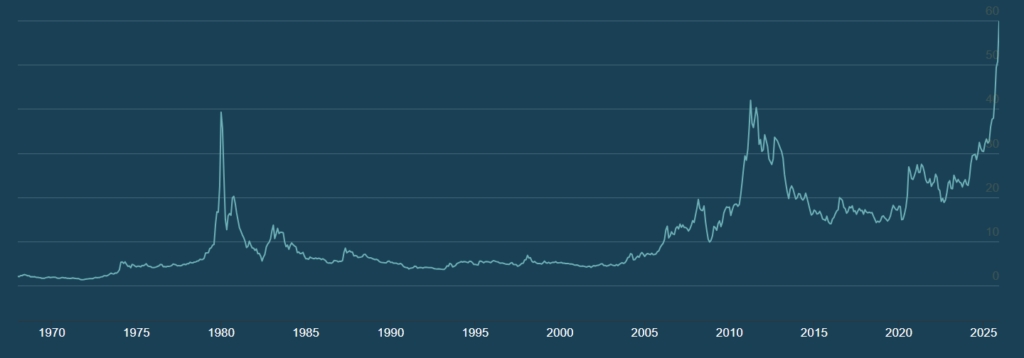 V središču letošnjega bikovskega cikla plemenitih kovin se je znašlo tudi srebro. Ta plemenita kovina je v letu 2025 pridobila kar 115 odstotkov vrednosti in se s tem uveljavila kot najbolj donosna v tem letu. Srebro je v tem mesecu doseglo novo rekordno vrednost 65 dolarjev za trojsko unčo. V preteklih bikovskih trgih je srebro pogosto prevzelo vodilno vlogo v zadnjih, zaključnih fazah rasti, kar pomeni, da bi trenutni vzpon lahko pomenil šele začetek daljšega obdobja rasti. Temelji rasti cene srebra so zelo trdni, poglavitna razloga zanjo pa sta veliko povpraševanje in hkrati omejena ponudba srebra. Povpraševanje in ponudba sta že dalj časa v neravnovesju, vrzel med njima pa postaja vse bolj izrazita, kar je zelo spodbudno za rast cene srebra. Tudi tehnične analize potrjujejo, da je prostora za rast cene srebra še veliko. Analitiki v grobem ocenjujejo, da bi srebro v prihodnjem letu lahko doseglo ceno med 100 in 150 dolarji za trojsko unčo, kar pomeni več kot podvojitev trenutnih vrednosti.